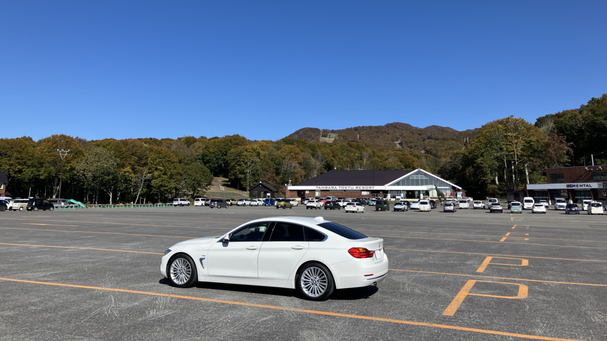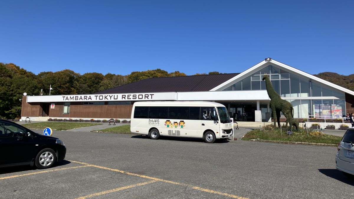 クマが出てきそうな山道を登っていくと、突然大きな駐車場が現れて「たんばら東急リゾート」に到着しました