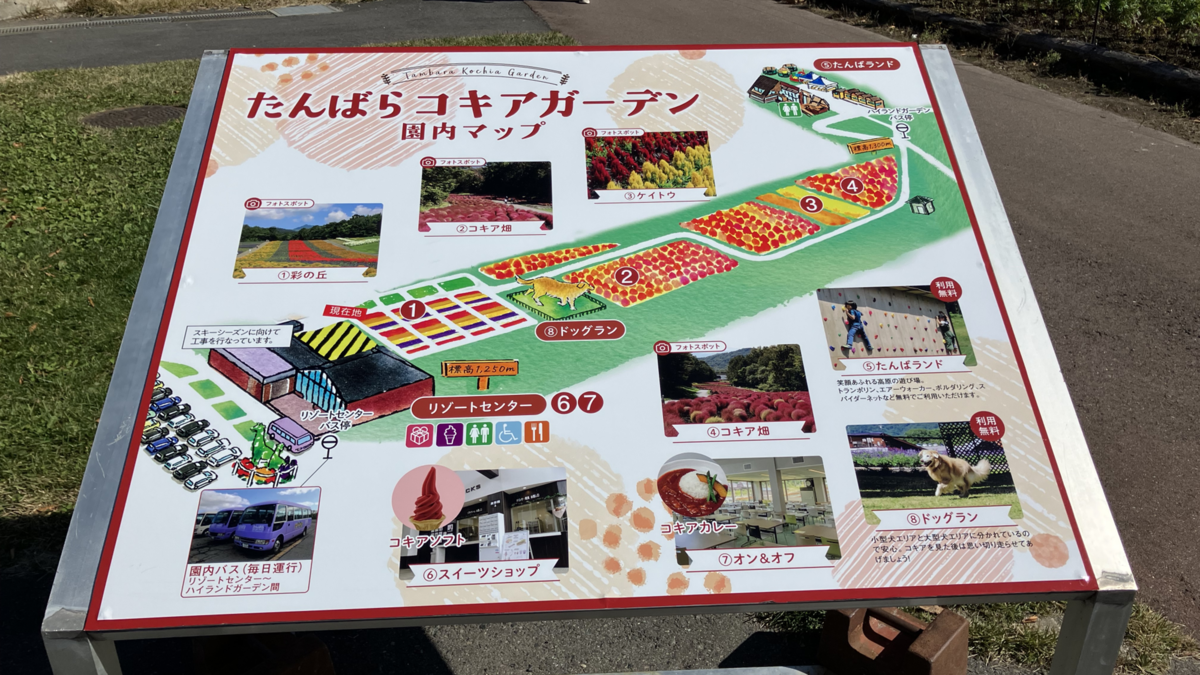 案内版をみると、ここは「彩の丘」と言うらしく、この上にコキア畑が広がっているみたい(SNS映えするポイントがいくつもあります)